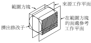 參考工作平面定義為修改子範圍之面上的平面。每個修改子具有定義圖徵範圍之不可見的範圍或邊界框。您可以建立參考範圍平面之一的工作平面。若要定義參考工作平面,請選取修改子和表示您希望建立之平面方向的來源工作平面。將偵測圖徵的範圍或邊界框,並且有兩個有效的參考工作平面可供選取。如果移動了修改子或重新調整了修改子的大小,則參考工作平面也將隨之移動。