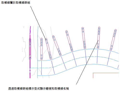 取樣線橫跨定線至指定的距離 (向左和向右)。通常,取樣線沿水平定線的給定樁號處建立。