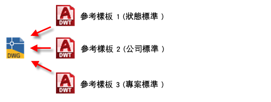 您可以有多個貼附至圖面的參考樣板。例如,您可能有狀態、公司、專案標準的樣板: