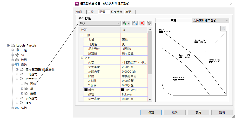 預覽宗地面積的自訂標示型式