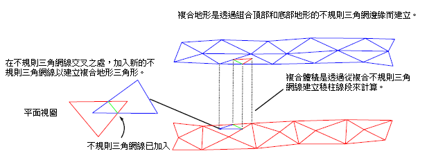 此方法使用兩個地形中的點,以及兩個地形之間的三角形邊緣相交的任何位置來從複合不規則三角網直線建立稜柱線段。