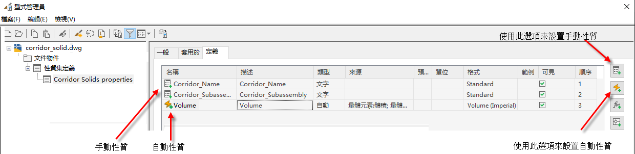 建立新性質集,並設置將與物件關聯的手動與自動性質。