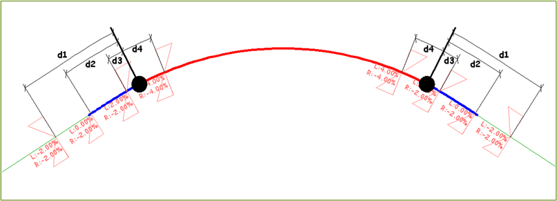 當您對定線幾何圖形進行掣點編輯時,超高臨界點的位置具有動態性,並且所有距離保持不變。