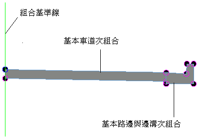 在組合基準線上加入一個或多個次組合物件 (例如行巷道、路緣和側坡),可以建立組合物件。這就構成了廊道橫斷面的設計。次組合係於一組目錄中提供的。