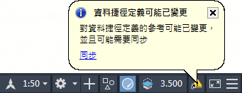 開啟圖面後,會自動同步資料參考。否則,如果參考物件過期,則旗標會顯示在探勘器樹狀目錄和圖面視窗的狀態列中。