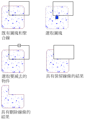 在不必重繪其餘任何組件的情況下,從線條中或從含有線條的圖塊中減去選取的部分。要減去的部分可以包含直線、聚合線 (封閉的或開放的)、弧、圓、文字或填充線,或者由它們描繪。如果減去作業刪除了部分封閉聚合線,則聚合線將重新生成閉合。如果減去作業將封閉聚合線分為兩部分,則這兩部分均將重新生成單獨的封閉聚合線。但是,當減去作業將填充線分為兩部分時,填充線將只剩下個別線條圖元,可以按一下任一部分來選取它。