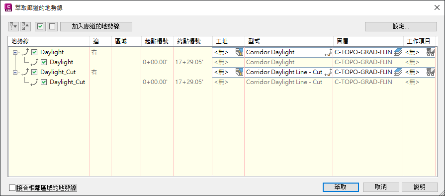 - 地勢線工址、型式、圖層與工作項目:使用這些選項可指定所萃取地勢線的設定。您可在按住 Shift 的同時按一下或按住 Ctrl 的同時按一下以選取多列。