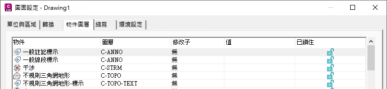 您可以在「圖面設定」對話方塊的「物件圖層」頁籤上指定物件的預設基本圖層。