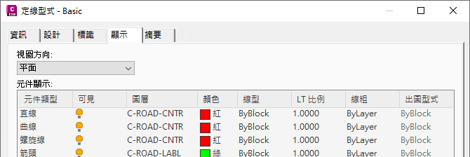 如果您習慣於透過操控圖層來控制物件,則可以將各種物件型式的「元件顯示」設定設定為「依圖層」。這樣,您即可使用 AutoCAD Layer 指令輕鬆地變更圖層設定,而不必透過編輯型式來變更物件元件的顏色、線型、線粗或出圖型式。