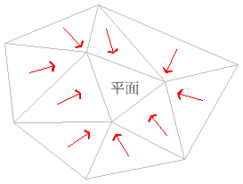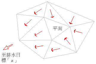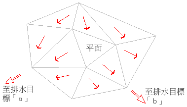 如果其中一些反向非平面三角形從此平面區域的邊界線向下傾斜,但都流向同一排水目標,則此平面區域就是該排水目標「a」的集水區的一部分,如下圖所示: