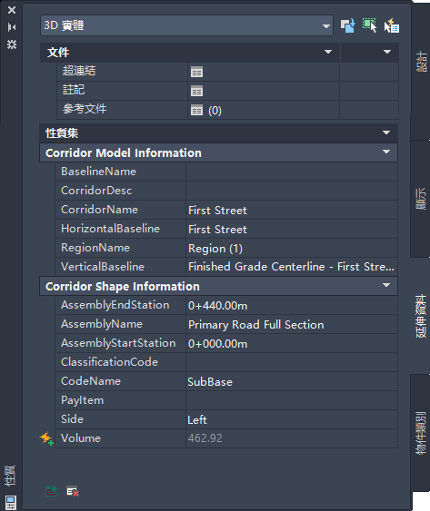 「型式管理員」中不提供建立適用於本體的性質集定義的功能,但 Autodesk Civil 3D 隨附的這三個性質集定義適用於本體以及從廊道萃取的 3D 實體。