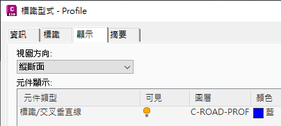 標識型式用於控制縱斷面視圖中交叉物件的外觀。在「標識型式」對話方塊的「顯示」頁籤上,可控制標識型式的外觀。從「視圖方向」清單中選取「縱斷面」,即可檢閱和編輯縱斷面視圖的標識型式的設定方式。有個元件可控制標識 (用於顯示交叉縱斷面、地勢線、測量圖形和 3D 聚合線) 及交叉垂直線 (用於顯示定線交叉) 的顯示。