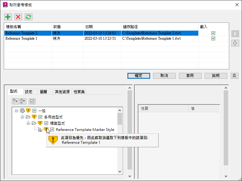 如果將會覆寫較低優先度樣板中的重複元件,則對話方塊的下半部會顯示警告符號。