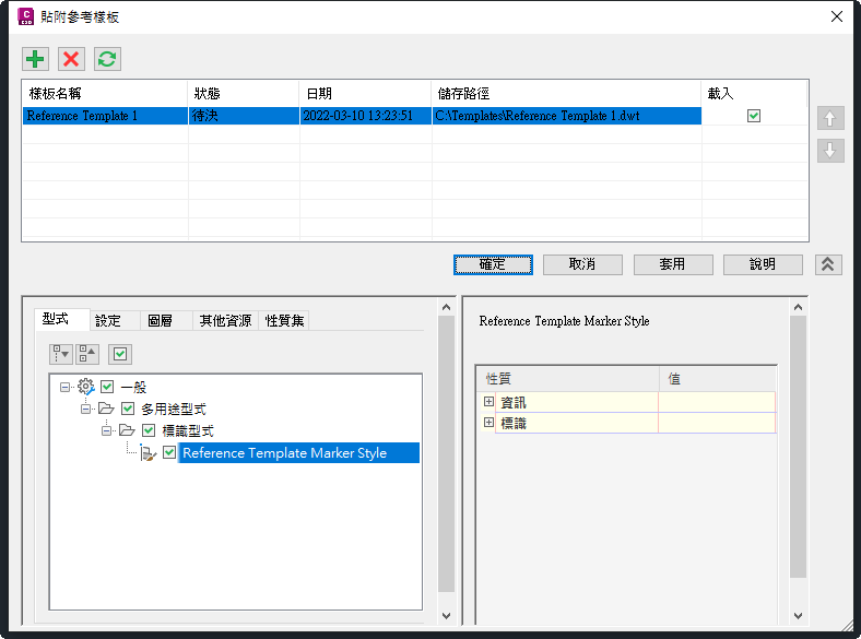 註: 若取消勾選「載入」勾選方塊並按一下「套用」或「確定」,就會從圖面中移除參考樣板中未使用的元件,而且對參考樣板所做的進一步變更並不會用於更新圖面。使用過的元件 (如圖層) 會繼續留在圖面中。
