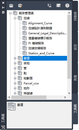 「工具箱」頁籤組織每個物件類型的報告。這些報告以緊密的可攜格式提供了有用的圖面工程資料。一些報告使用 LandXML 格式,具有預先定義或自訂的 XSL 型式表。其他報告為 .NET 格式,可提供可讓您選取資料和不同選項的自訂對話方塊。