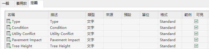 透過在標準標示型式設置程序中使用「性質集」頁籤,您可以將這些性質加入至點標示型式,以便您可以使用此資訊標示點。