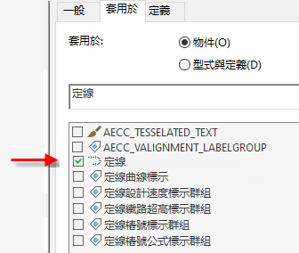 對於大多數標示類型,請在「型式管理員」的「套用於」頁籤上,選取您要標示的物件類型,而並非選取相關物件的標示類型 (例外情況請參閱下節)。例如,如果要標示帶性質資料的定線,請選取設置性質集時的定線。