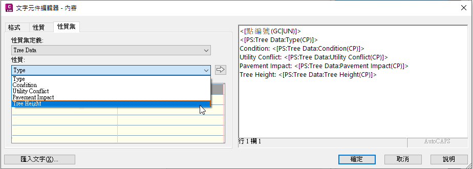 標示型式設置如下。您可以使用「文字元件編輯器」中的「性質集」頁籤,以將性質集中的性質加入至標示型式。