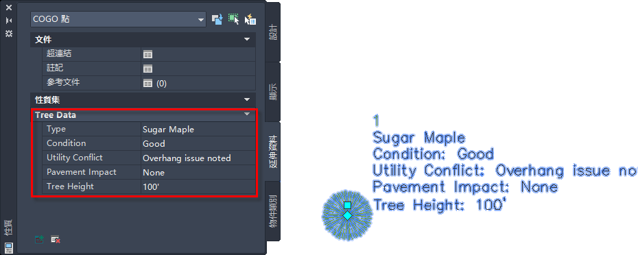 例如,您可能有指定至點的自訂性質資訊,例如樹種類型、條件和其他資料。