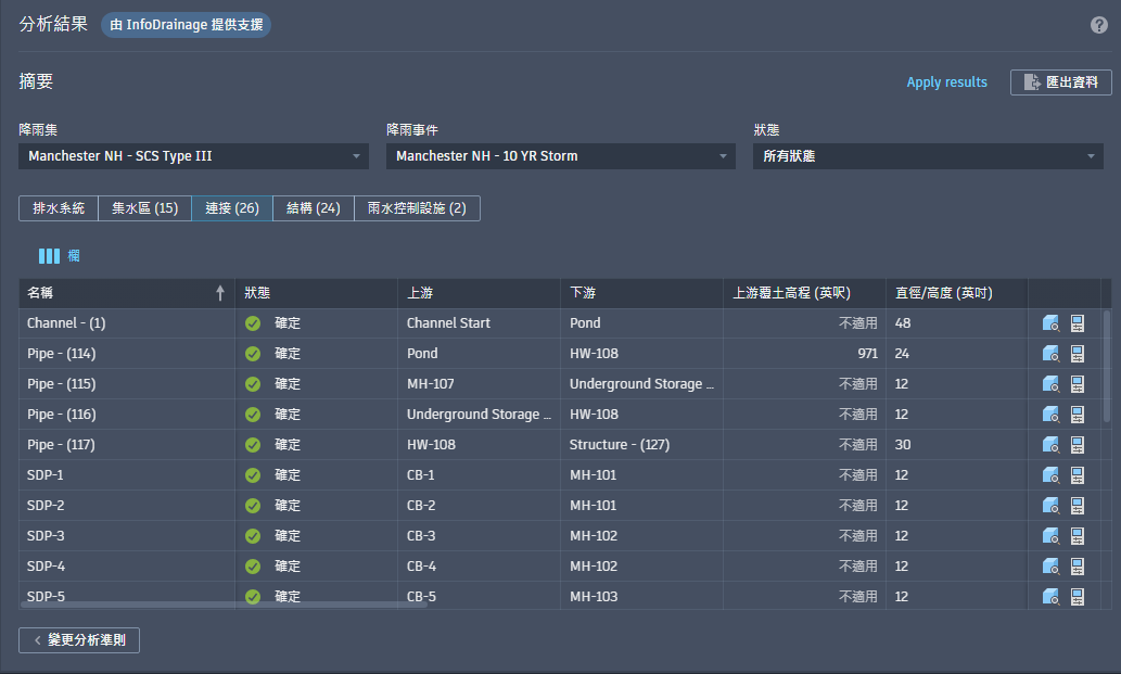 完成系統分析後,將在系統層級依如下物件品類報告結果:流入量、管、結構和雨水。