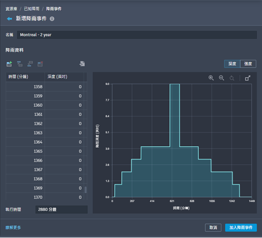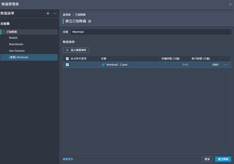 按一下「加入降雨事件」,以將事件加入至已知降雨集。「建立已知降雨」編輯器隨即顯示,其中展示更新的降雨事件清單。