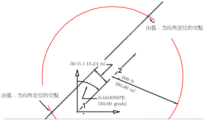 交點位於以點 2 為中心、半徑為 200 的弧,與從點 1 繪製的方向角為 50.0000、向左偏移距離 50 的直線相交處。