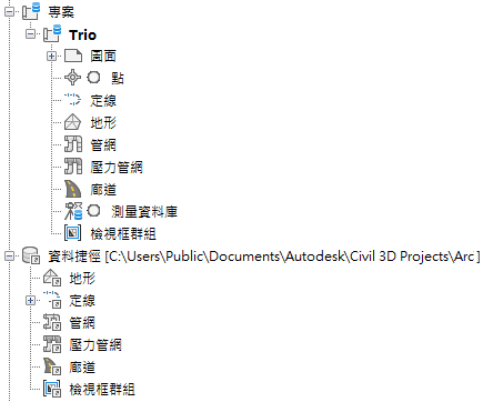 圖中展示了名為 Trio 的 Vault 專案的集合和名為 Arc 的資料捷徑專案的集合。兩個專案類型均是從預設的專案樣板建立的。因此,它們具有完全相同的地形、定線以及其他物件集合,並可以將這些集合做為多個圖面中的參考。