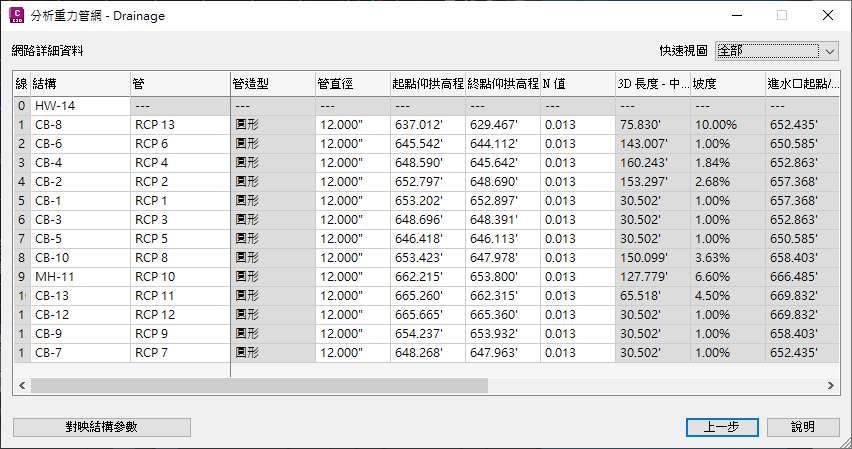 錯誤和警告也會顯示在表格下方,以及「分析重力管網」對話方塊其「一般」頁面上的「網路詳細資料」按鈕下方。