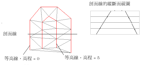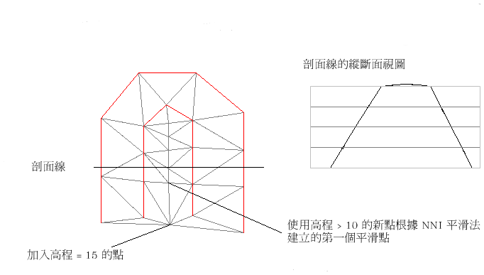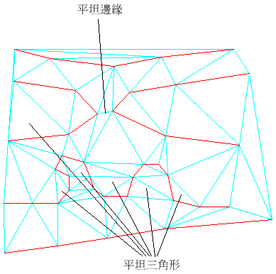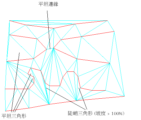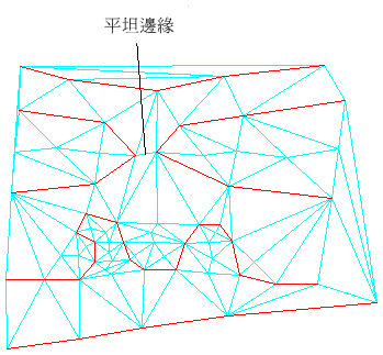 將等高線資料加入至不規則三角網地形後,結果地形會包含平面點位 (其點均來自同一等高線的三角形) 和平面邊緣 (接合來自同一等高線或不同等高線同一高程處之點的三角形邊緣)。