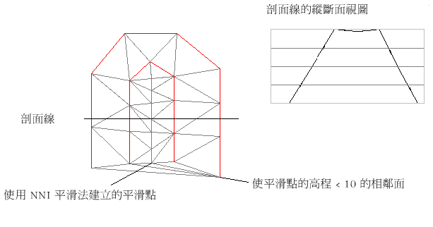 此選項所稱的平面邊緣,是指連結兩條相同高程資料等高線但不在平面三角形中的邊緣。將掃瞄地形,以查找兩個端點都位於資料等高線上的平面邊緣。如果包含此邊緣的兩個三角形的相對點均位於高於此邊緣 (或均位於低於此邊緣) 的高程處,則將在此平面邊的中點處加入新點。此新點的高程透過 NNI 平滑法來計算。由於加入了新的點和邊緣,因此該選項可以增加地形的大小。