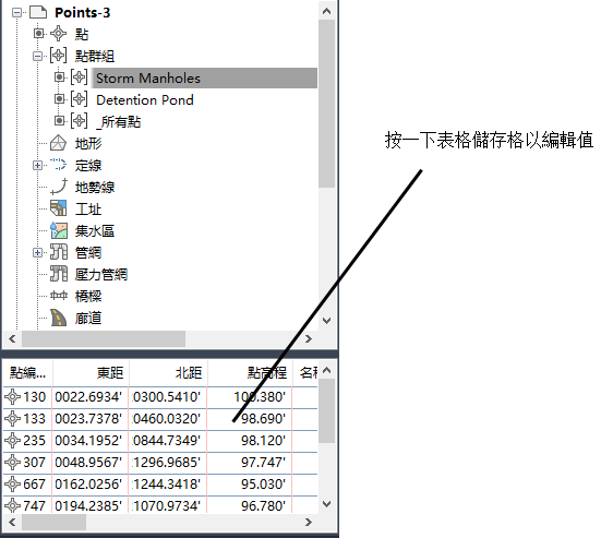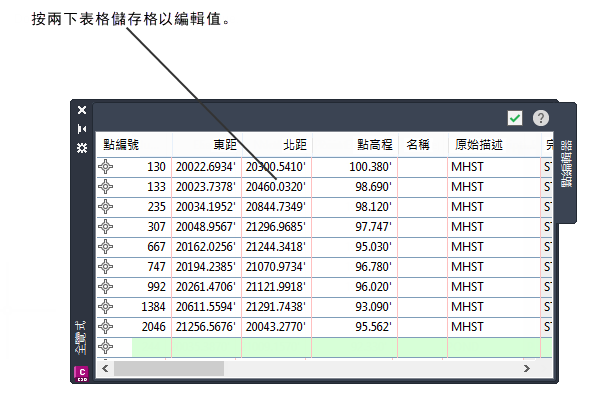 某些物件類型 (例如定線和縱斷面) 使用全覽式視窗來顯示組成此物件的圖元表格。