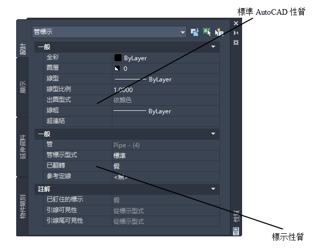 編輯管標示的 AutoCAD 性質
