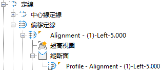 偏移定線會在「探勘器」中新增至「偏移定線」集合。偏移縱斷面會在指定偏移定線集合的「縱斷面」集合內建立。