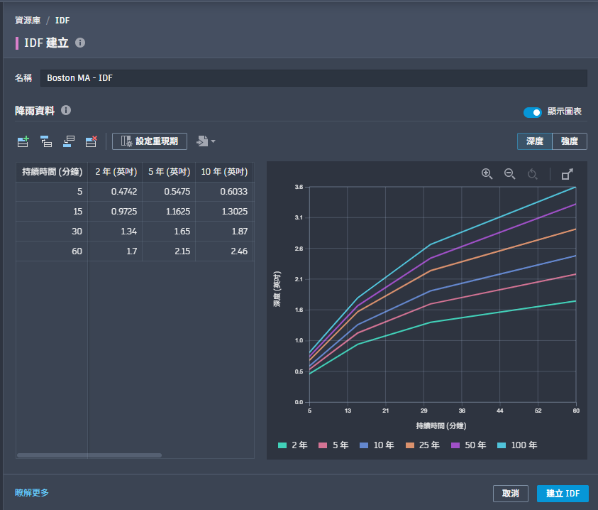 透過為不同降雨持續時間指定降雨強度 (或深度) 值,可以為不同重現期建立多條 IDF 降雨曲線。