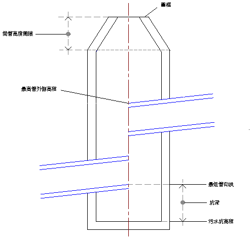如果上移結構的污水坑,並且將「控制污水坑的方式」性質設定為「高程」,則污水坑最遠僅可以上移至垂直管間隙區域的底部。