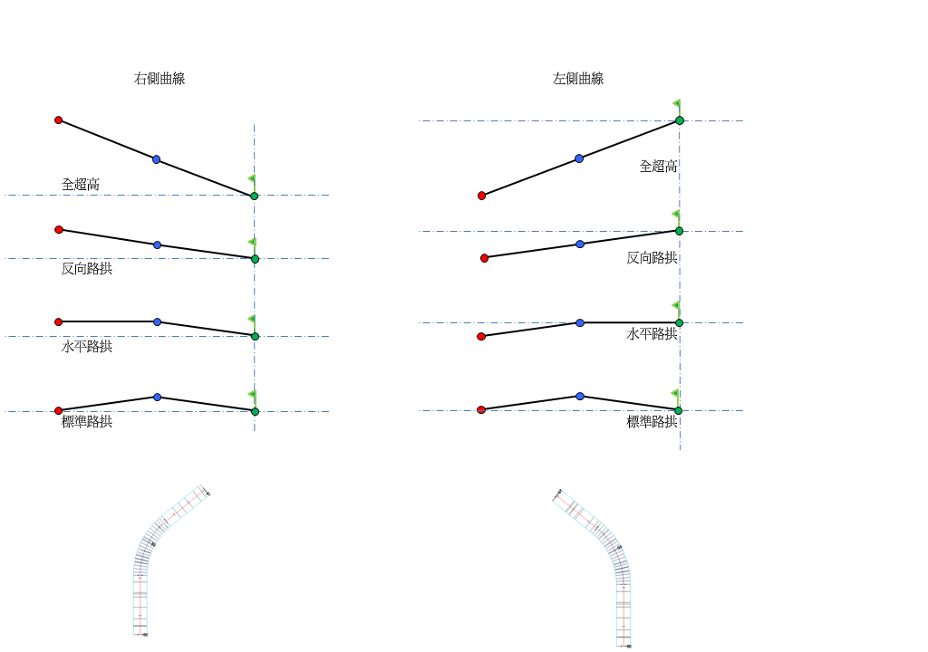 位於右側的樞軸 (未分割的拱形道路上的超高)