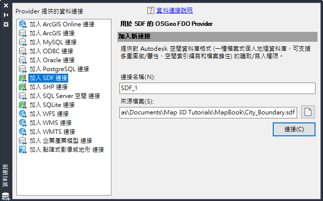 - 在「資料連接」視窗中,於「Provider 提供的資料連接」下 (左側),選取「加入 SDF 連接」。