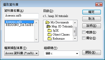 - 在「選取資料庫」對話方塊中,導覽至範例檔案,然後選取 Assessor.mdb 檔案。