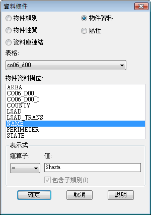 當您將圖面貼附至地圖時,圖面中的物件不會立即顯示在地圖中。您必須將它們查詢進來。您貼附的圖面檔案是具有為每個郡定義了多邊形的加利福尼亞的地圖。由於雷丁市位於沙斯塔郡,因此您需要將沙斯塔郡的邊界加入至地圖。您可以根據位置、性質或資料將資料查詢進來。在此例中,將查詢儲存為物件資料的郡名。