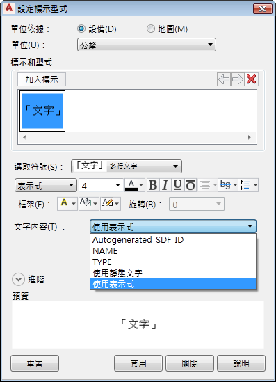 - 在「設定標示型式」對話方塊中,為「文字內容」選取「使用表示式」。