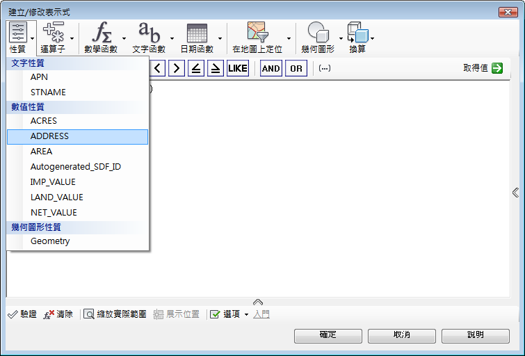 - 若要取代第一個性質項目,選取項目,然後按一下「建立/修改表示式」視窗頂部的「性質」。選取數字性質「ADDRESS」。