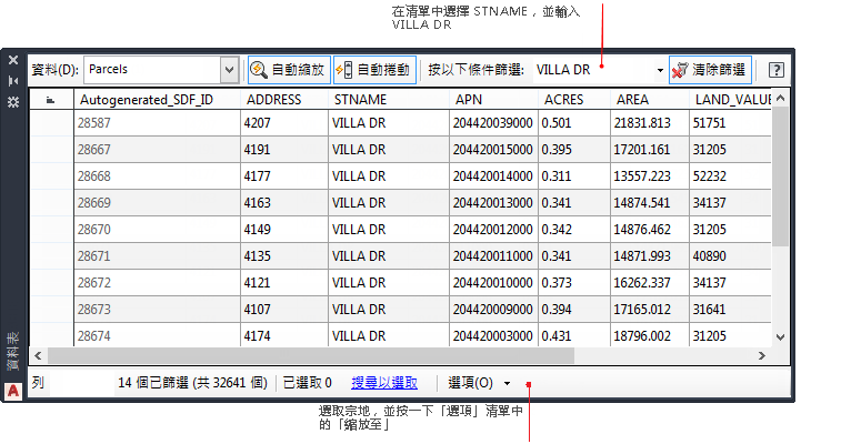 顯示所有圖層的「資料表」。 篩選「資料表」以展示宗地的子集 - 在此例中僅為 Villa Drive 上的宗地。