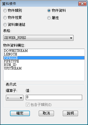 - 在「物件資料欄位」下,選取「PIPESIZE」。