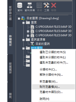 - 在「工作窗格」的「地圖總管」頁籤上的「物件類別」上按一下右鍵,然後按一下「貼附定義檔」,以貼附物件定義檔。