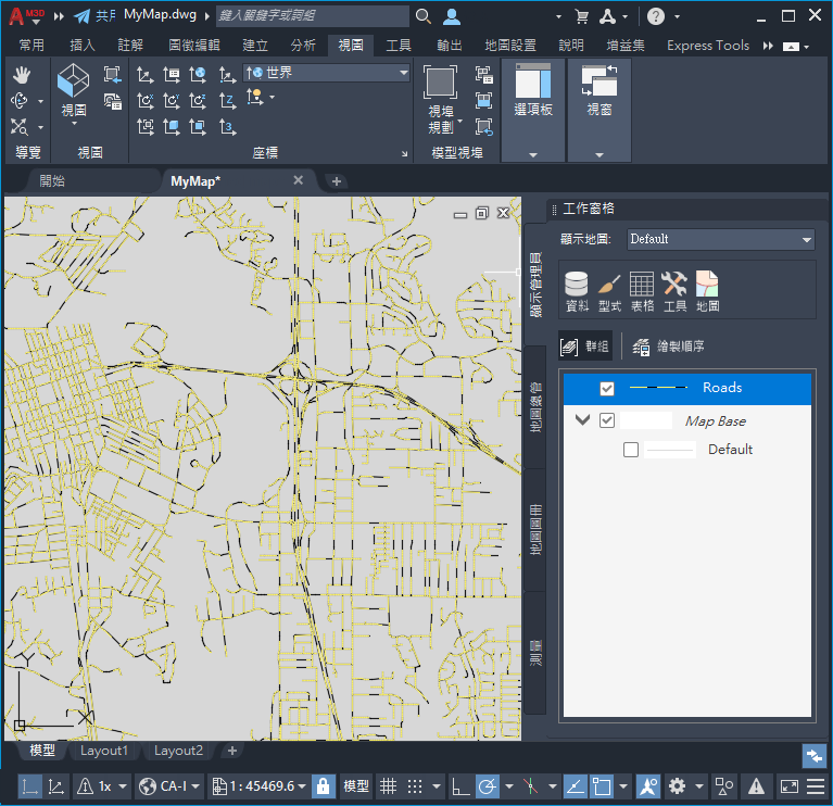 請注意,此地圖檔與 AutoCAD 圖面一樣,使用檔案副檔名 .dwg。兩種檔案類型均使用相同的基本檔案格式。
