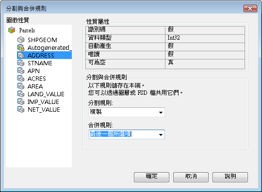 使用分割,您可以在分割與合併空間圖徵時,設定指定性質的規則。您可以對這些規則使用表示式。