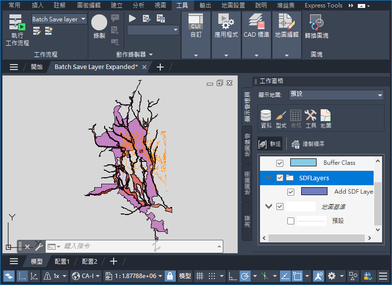 圖層會加入至地圖並加入至新「顯示管理員」群組。系統會提示您指定 DWG 檔案的名稱和位置。.layer 檔會儲存至動作中指定的位置。