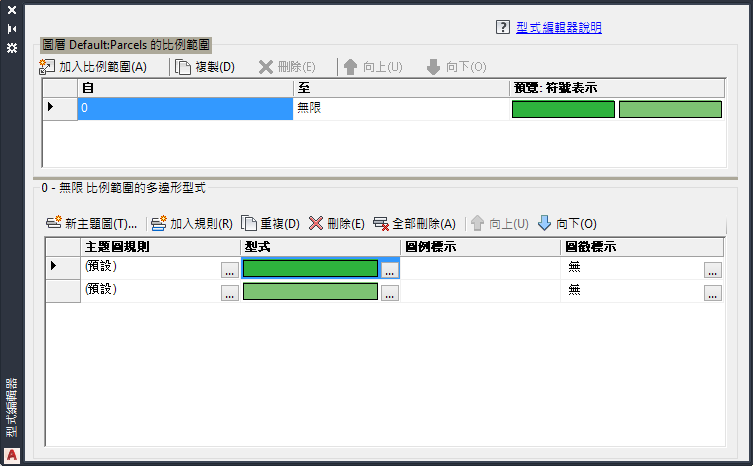 - 在「型式編輯器」中的「0 - 無限比例範圍的點陣式型式」下,按一下「型式」項目中的下拉箭頭。選取「主題圖」(即使已經選取)。
