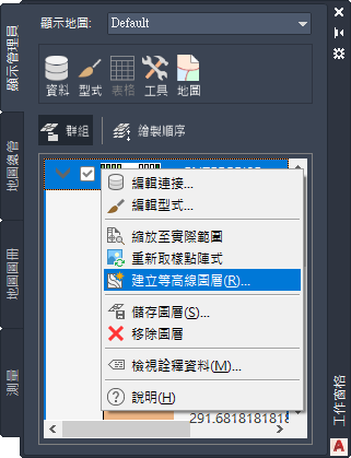 - 在「顯示管理員」中的地形圖層上按一下右鍵,然後按一下「建立等高線圖層」。