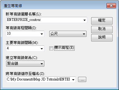 - 在「產生等高線」對話方塊中的「等高線高程間隔」清單中,選取「20」。